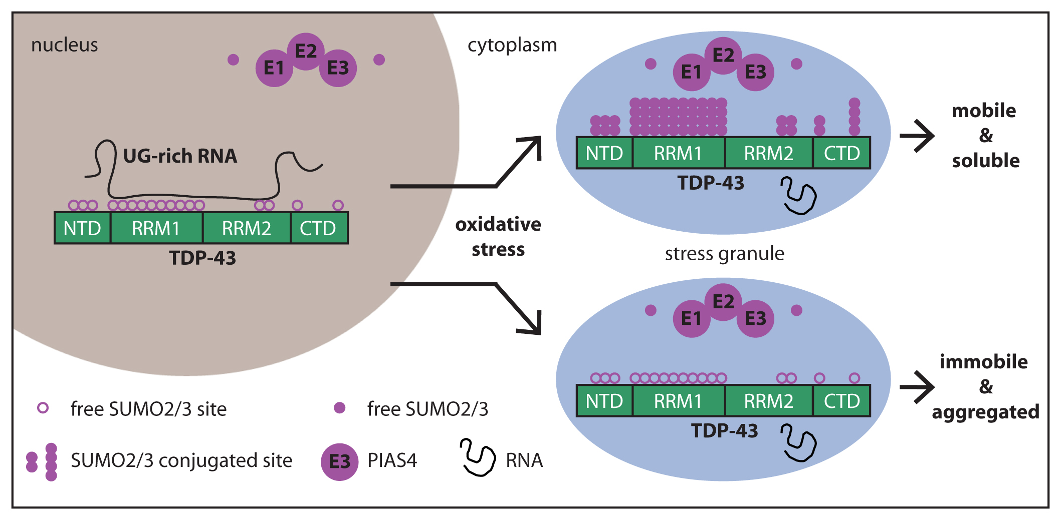 When cells are not subjected to stress, TDP-43 is mainly localized inside the nucleus, where it binds with high affinity to UG-rich RNA. RNA masks the K residues located in the RRM1 and RRM2, reducing the access to PIAS4. Upon oxidative stress, a fraction of TDP-43 translocates into the cytoplasm, where it localizes inside SGs along with the SUMO machinery (free SUMO2/3, E1, E2 and E3 enzymes, including PIAS4). RNA-free TDP-43 molecules can be efficiently conjugated to SUMO2/3 by PIAS4, thereby protecting TDP-43 from immobilization inside SGs and aggregation.